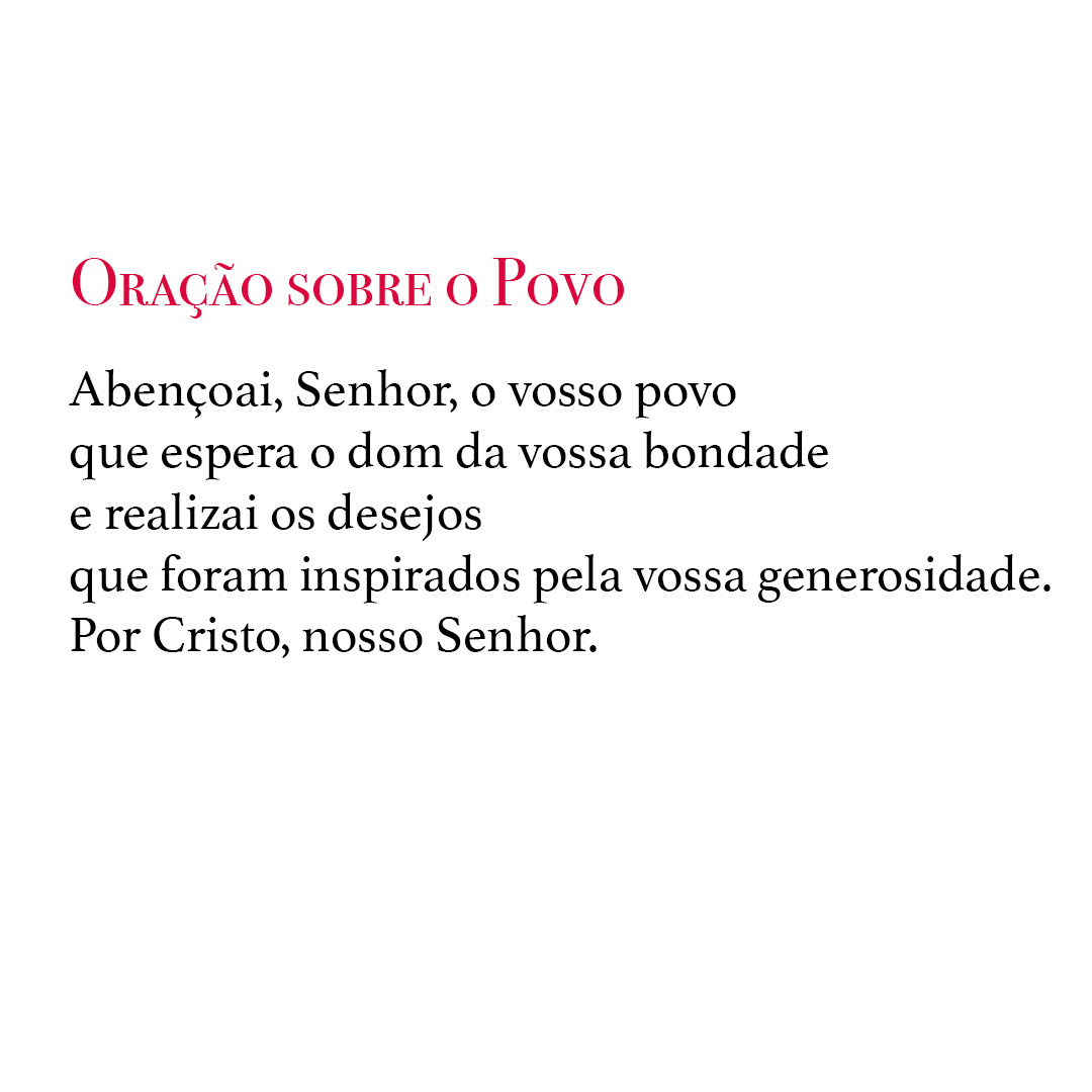 MR1993 | Abençoai, ó Deus, o vosso povo que confia em vossa misericórdia, e realizai os desejos que vós mesmo lhe inspirastes. Por. | MR2023 | Abençoai, Senhor, o vosso povo que espera o dom da vossa bondade e realizai os desejos que foraminspirados pela vossa generosidade. Por. |